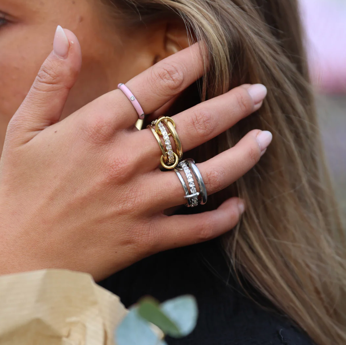 Trendy, shiny, and made to stand out. This stacked ring in stainless steel adds a cool edge to any outfit. Available in silver or gold.