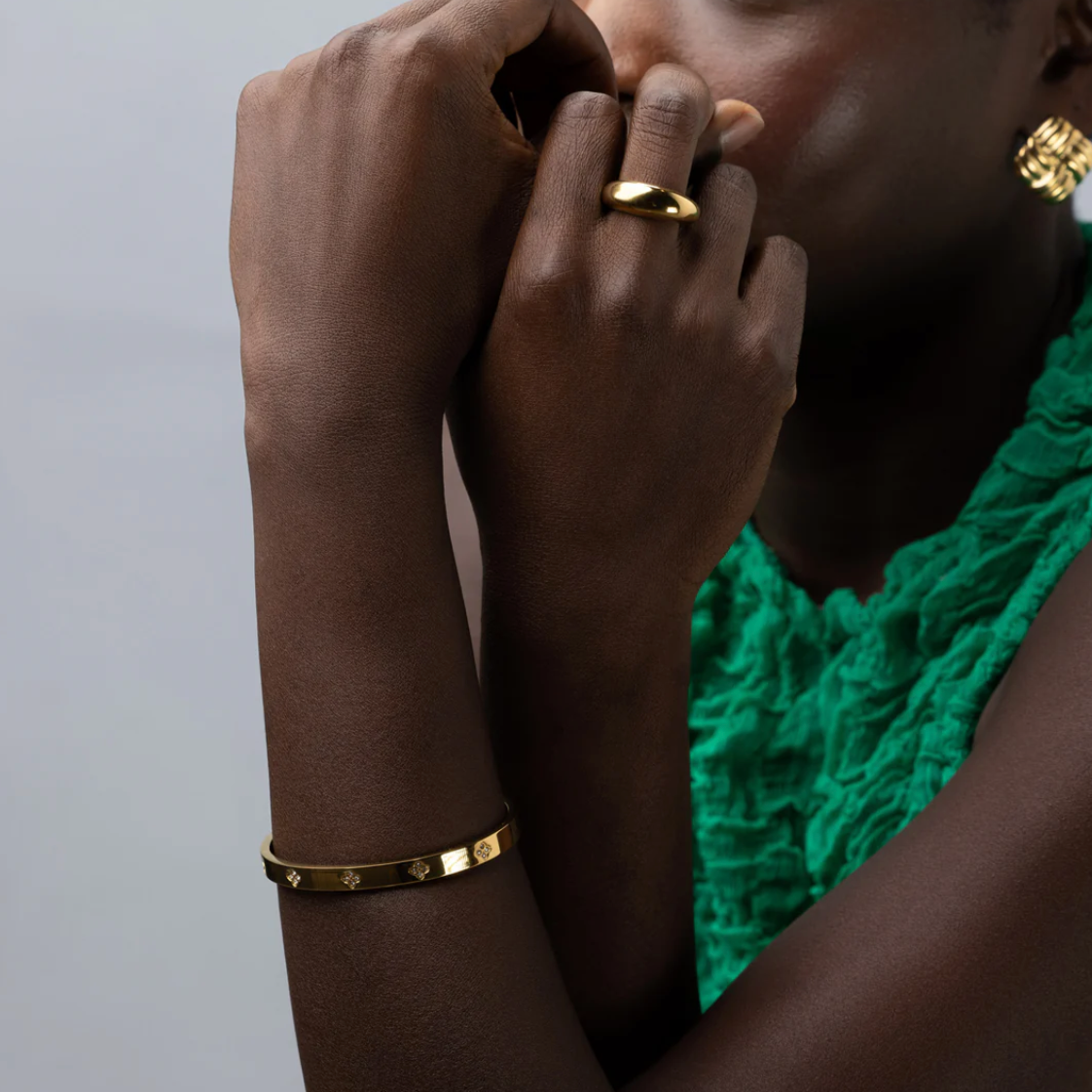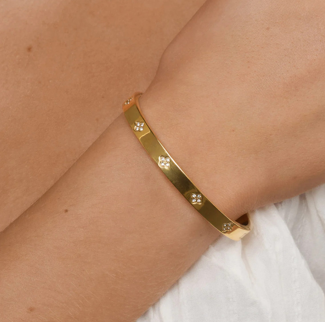 Luck meets luxury with the Liv Crystal Clover Bangle. Featuring a delicate clover s and crystals, this stainless steel cuff bracelet is your go to for timeless elegance. Whether you're manifesting good fortune or elevating your style, Liv has got your back. Durable, water resistant and effortlessly chic.