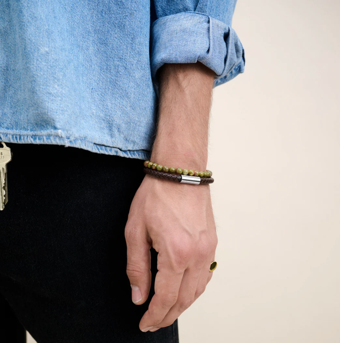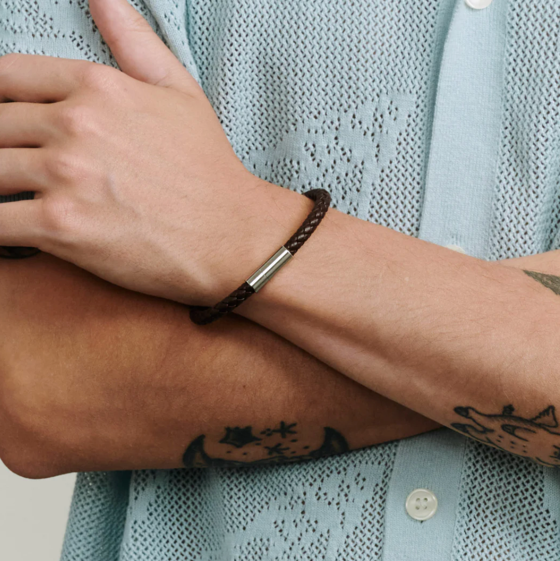 A classic blend of materials with this leather bracelet for men. This bracelet combines durable soft leather with stainless steel accents for a timeless and versatile look.