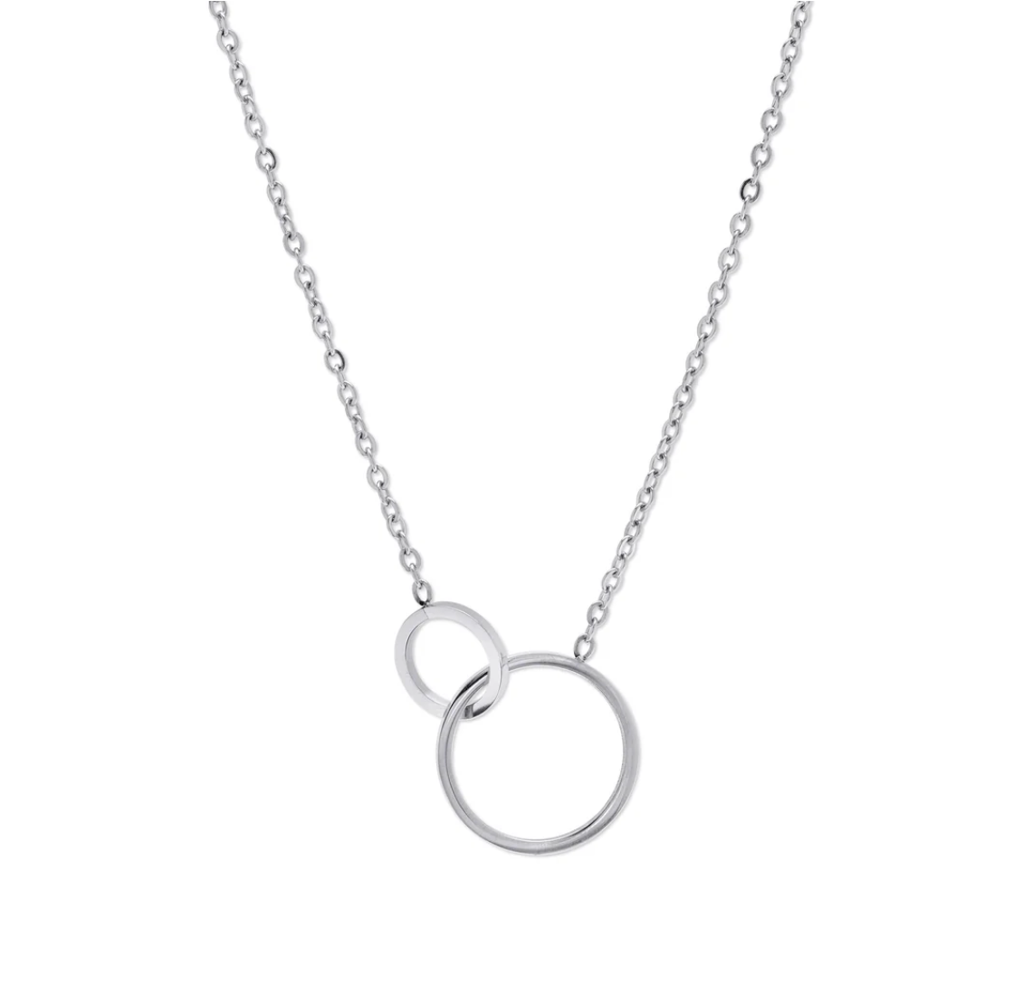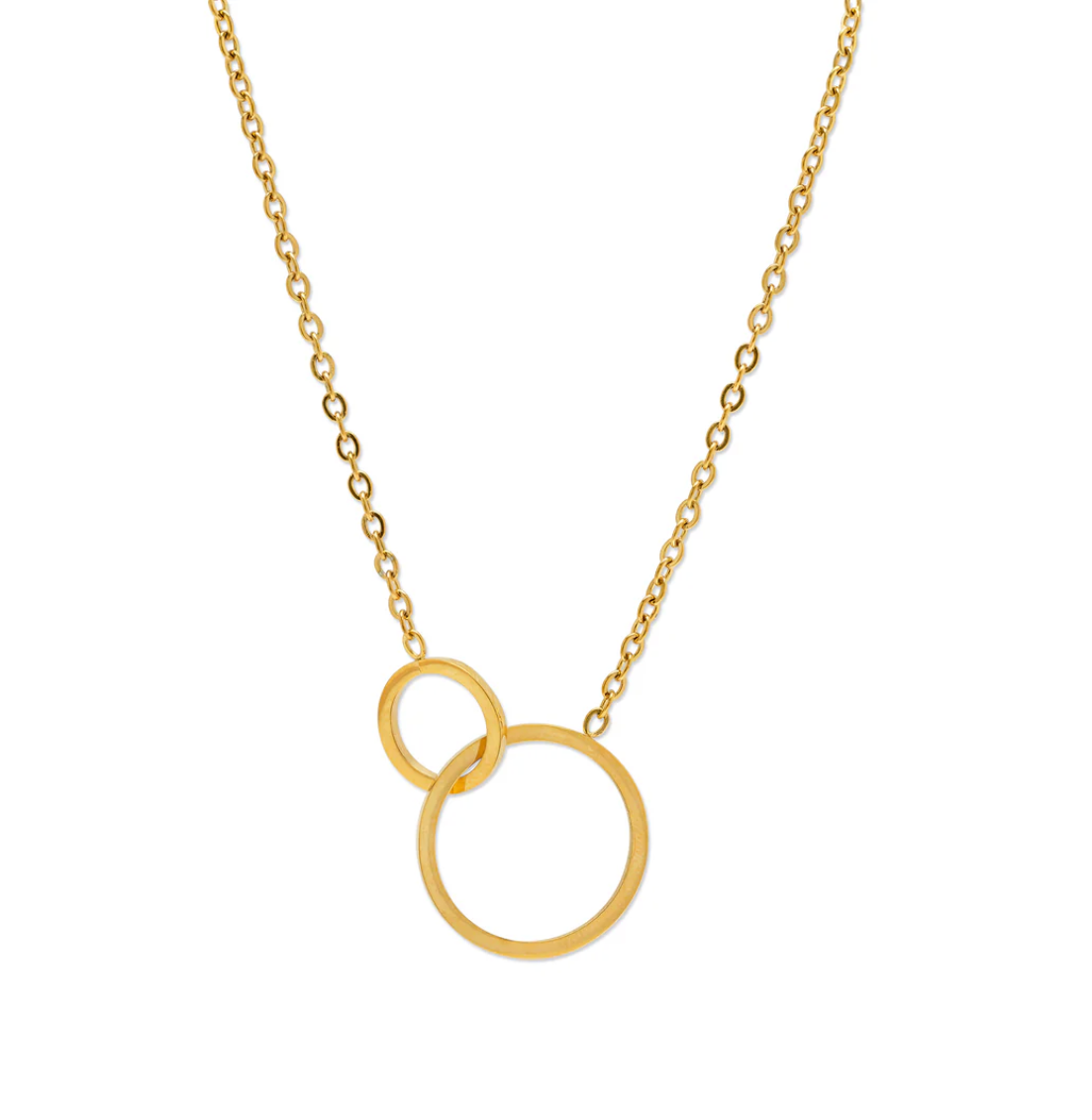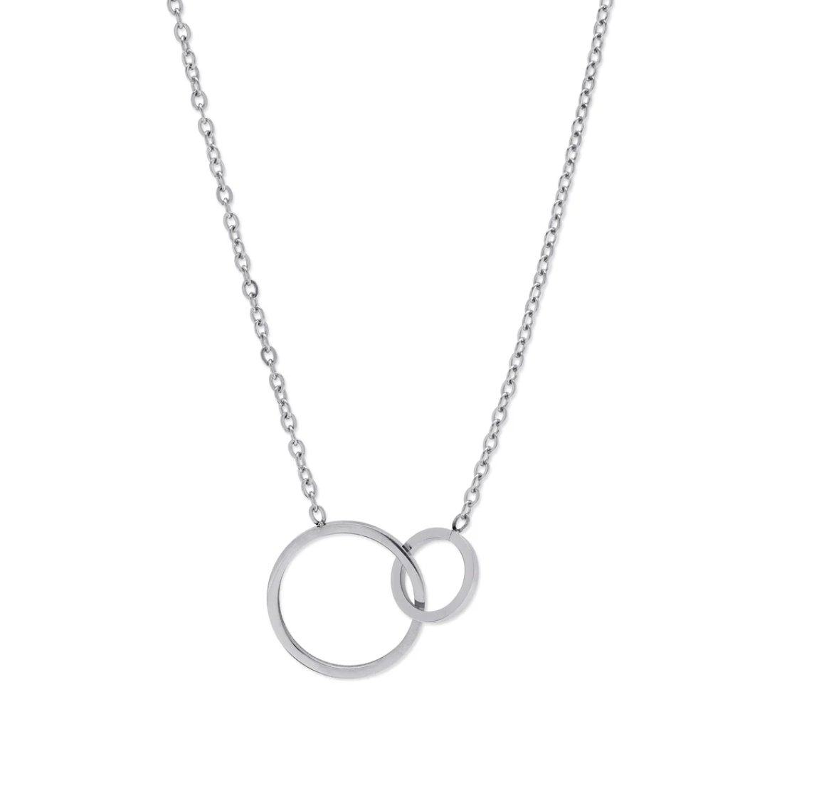 Modern and symbolic circle necklace. This stainless steel necklace features sleek interlocked circles, is water-resistant, and tarnish-free for contemporary elegance. Available in silver & gold to fit your style and needs.